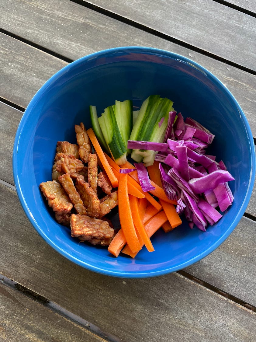 Leftover tempeh and veggies are great with leftover peanut sauce.